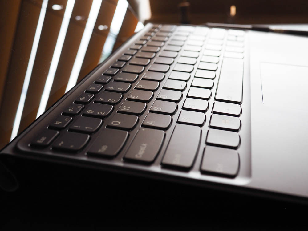 The second part of the Lenovo Miix 630 is the keyboard cover. It features full-sized keys with backlighting, a touchpad, and a little loop to hold the digital stylus. The back of the cover is hinged in the middle and can be bent to act as a stand that can be angled in a bunch of different positions. The tablet portion is held in place with some super powerful magnets. When the keyboard is not in use, it acts as the screen cover. Overall though, the keyboard cover is pretty nicely made. It’s got that leathery look and feel and the rear hinge for the stand is pretty strong. The keyboard is also pretty nice and feels nice a clicky.