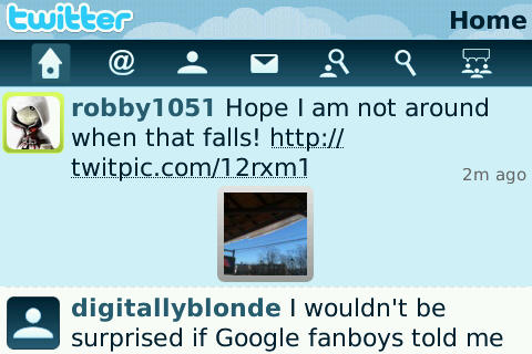 If you notice above, the twitter app actually shows a thumbnail of twitpics that users attach. I’m not sure if it will show an inline image if it comes from any other source however as I was not able to test that portion. If you click on the image, you can even enlarge it to full screen.
