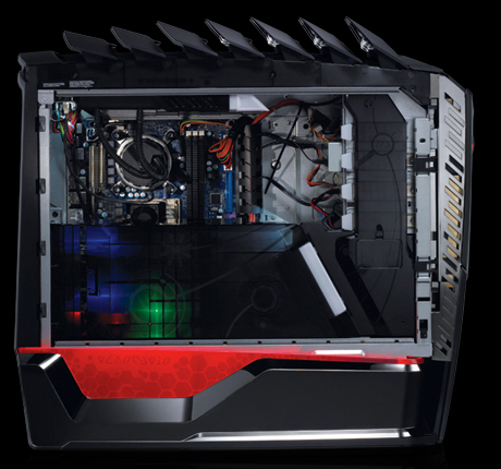 This case has a front motorized door so with a touch of a button the front panel will slide down revealing the 5.25 inch bays for your cd/dvd drives. Both sides of the case swing open from built in hinges reducing the hassle of screwing in your side panel after tweaking with your hardware. Another thing Alienware adds to appease the crowd is custom lighting or better known as their “Alien FX”. Basically different parts of the case have lights and you can change each light to your own whim. As computer builders know, a case has to have good airflow. On the top of the case there are fins which adjust to the temperature of your system allowing more hot air to escape. This feature is also manually adjustable so the choice of up or down or in between is up to you. Flip it to the other side and you will see that Alienware has taken an innovative step and placed the hard drives on this side. It features 6 hard drive slots allowing you a whole lot of space.