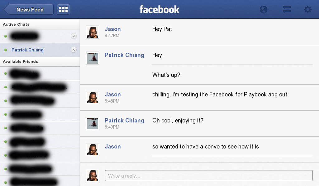 Also i was liking the chat and messages area. Both areas get the job done and works very well. If you are a Playbook/Facebook user, then the app is one you should definitely download. You can download it now in the Blackberry AppWorld. Hopefully this is just a start. Would love to see a Twitter app, as well as a few other high profile apps (Skype anyone!)