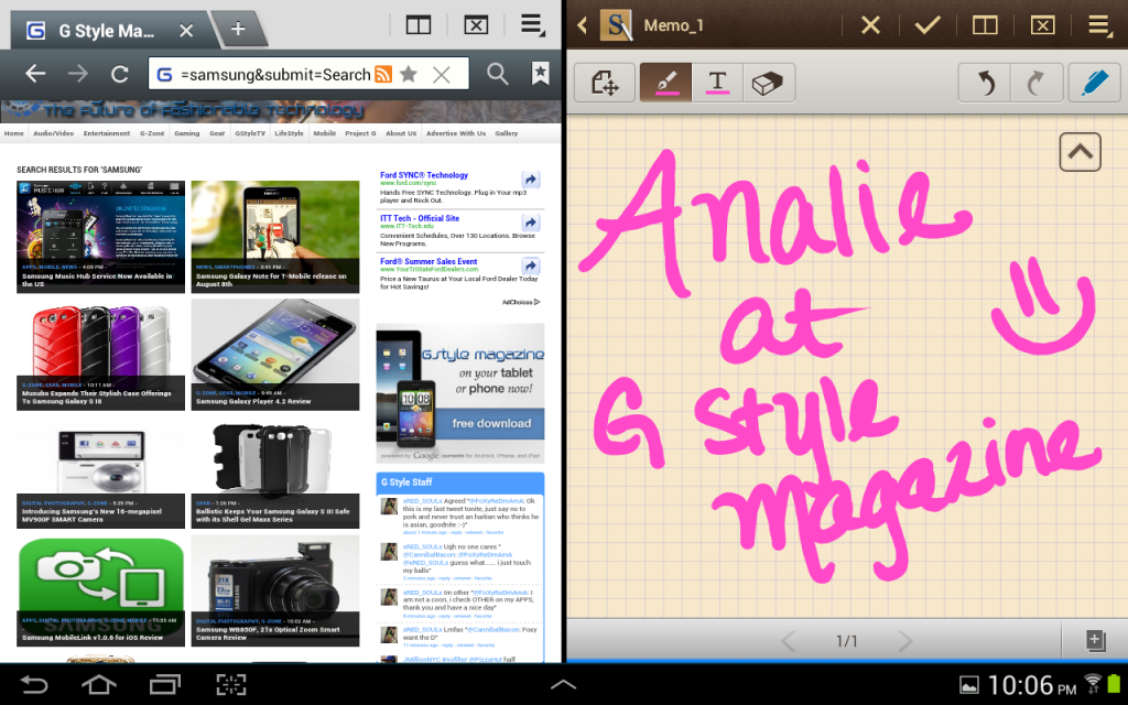 You’re going to be using S Note a lot until the developers come out with other apps to capitalize on the S pen. With S Note, you can change the variety of “pens” you have. Color and brush options are available as well. I found it easy to make notes and use a variety of colors and highlights. Thankfully there is also handwriting recognition, it can recognize the most illegible handwriting and turn it into text font. I tried to be as messy as possible; but it got it every time. The best part of the whole S Pen use is that I don’t have to worry about smudging or messing up work with my palm; a great feature for a clumsy editor. The screen responded smoothly to the S Pen. Scrolling and multi-tasking presented no problem or lag.