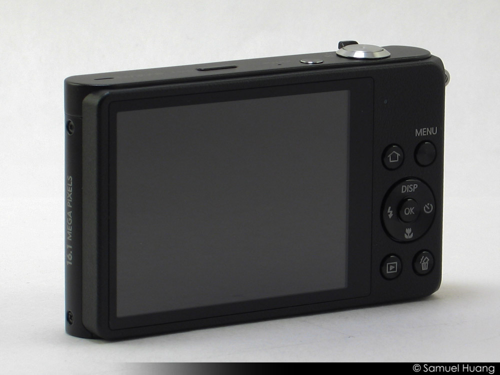 First of all, the Samsung FV300F looks like pretty much every other sub-compact camera out there. The only thing that really separates it from other cameras is its huge SAMSUNG logo embossed right on the front of the camera. It has a pretty standard camera layout when seen from the front. Most of the front is flat except for a tiny lip on the left that acts as a hand grip and the rim around the lens protrudes a tiny bit. The lens is located prominently on the right of the camera but where most cameras might have their flash unit to the upper right of the camera, the FV300F puts it just left of the lens. I was a bit worried about maybe having a finger block this, but it’s high up enough where it won’t. A tiny bit right of the flash is the AF-assist light. In the big open space below the flash is where the front facing LCD resides. It’s hidden quite well and you don’t even notice it until you turn it on.