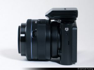 Rotating the camera clockwise to the side, you’ll see it’s fairly sparse here except for the strap eyelet up near the top and a tiny speaker near the middle. From this angle, you can also see how far the lens mount comes out, which is a good half an inch. If you have the kit lens attached, you’ll also notice from the side view that the camera leans forward due to the weight of the lens. The Olympus PEN cameras suffer from this too so it’s not something unique to the NX1000.