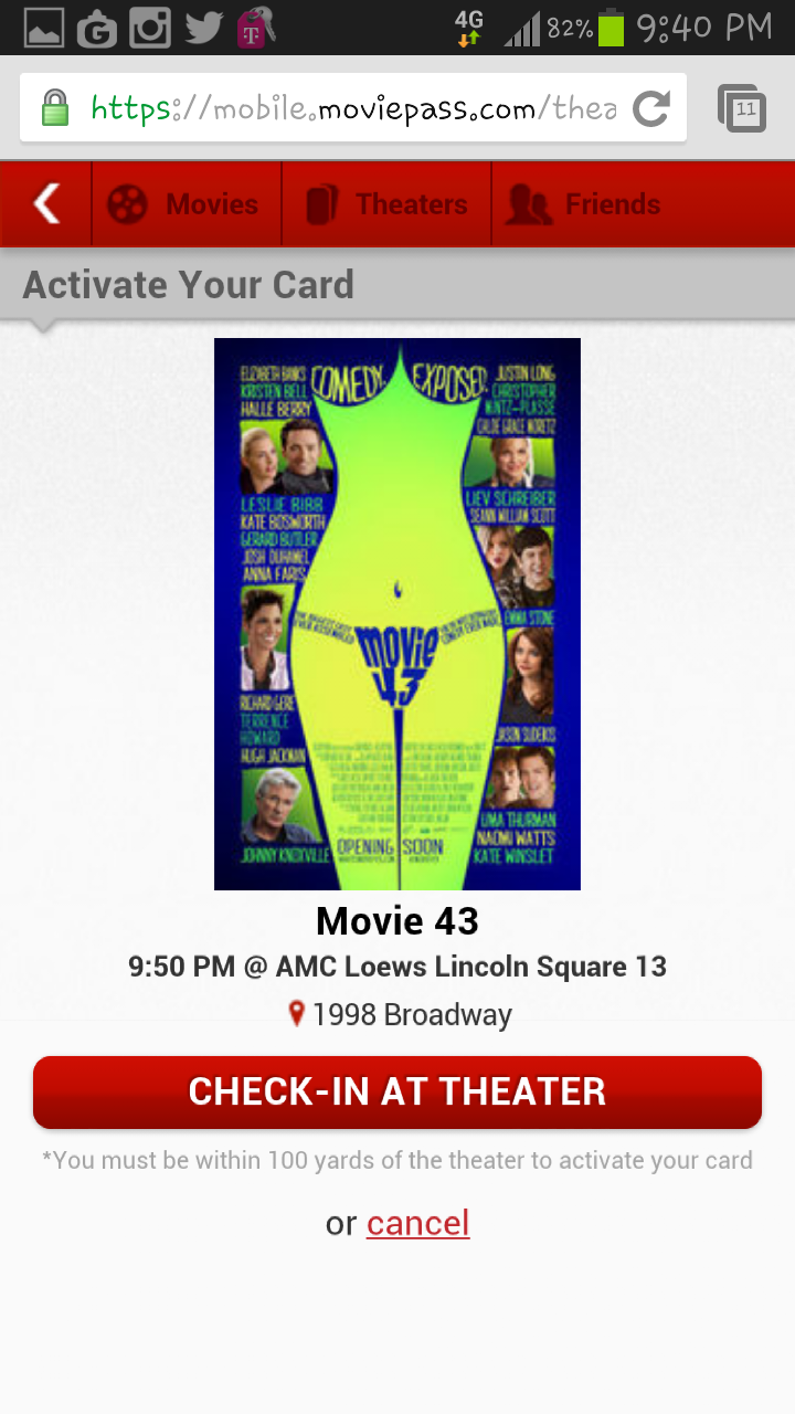 There are some requirements to make this a success. You have to “check-in” into the movie theater by selecting the showtime of the movie you want to see either via the iOS app that is available or if your like me via the mobile web since there isn’t an Android app yet (cmon MoviePass). You have to be within 100 yards of the theater and do so within 30 mins of the film. Hasn’t been a hassle so far on my part but can imagine for those large blockbusters that sell out pretty quick starting in the Spring. Another kicker is it’s a one year subscription, if you cancel before so a fee will be applied. After 1 year you can cancel without penalties.