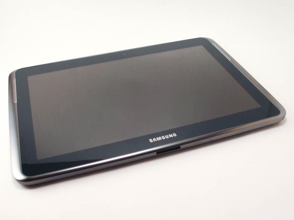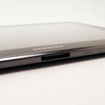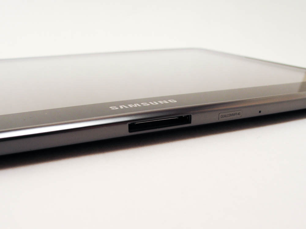 The Note 10.1 is pretty much like every other Samsung device out there in that it is made mostly entirely of polycarbonate plastic. The entire rear panel is made of plastic but is framed by what I’m assuming is a metal band and not just metallic painted plastic, but I could be wrong as it is hard to tell. The only other bits of metal on the device that I could see from the outside are the speaker grills, the frame around the rear lens element, and the inside of the sync/charging port and audio jack. The only other thing not plastic is the giant glass screen.