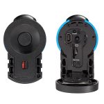 At the bottom of the main body, there is a rather large portion made of plastic. This portion is part of the rail system used to attach the ContourROAM2 on to various mounts. The kit I received included a profile mount and a rotating flat surface mount although you’ll probably want to pick up other specialized mounts for whatever application you will use the camera on. On the front side of the plastic mount piece, you’ll see that there is a record light that glows red when the unit is recording as well as a small hole which I’m assuming is where the mic is. As a bonus, you can also attach the ContourROAM2 to any tripod as is has a tripod mount hole at the bottom.