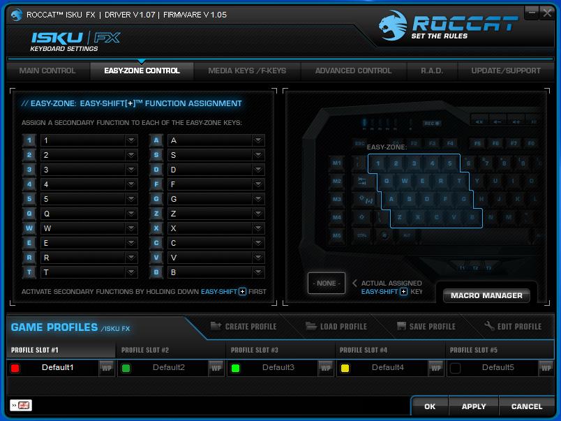 The second tab allows you to customize the Easy-Zone controls. These are the 20 keys on the regular keyboard that you can assign macros to. In order to use them, you will need to activate the Easy-Shift feature, otherwise they won’t do anything other than their regular key functions.