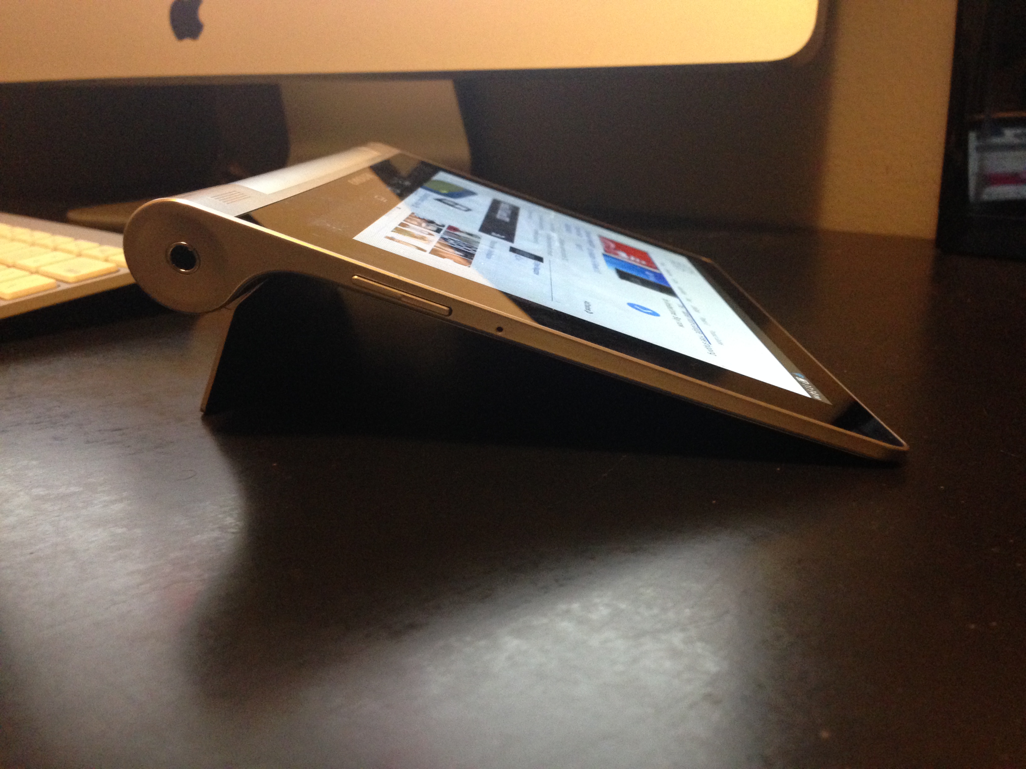 At first glance, after you take it out of the box and before you power it on you notice right away just how thin, light and well constructed the Yoga 8 is. It doesn’t feel cheap at all. The design is different from the rectangular box look I typically see with tablets. The Yoga 8 has a rounded protruding bottom end which discreetly hides the power button on one side and the headphone jack on the other. Initially I didn’t understand the reason for the rounded end until I turned it to the back and I saw the flap for the kickstand. I had an “ohhhhhh” moment.