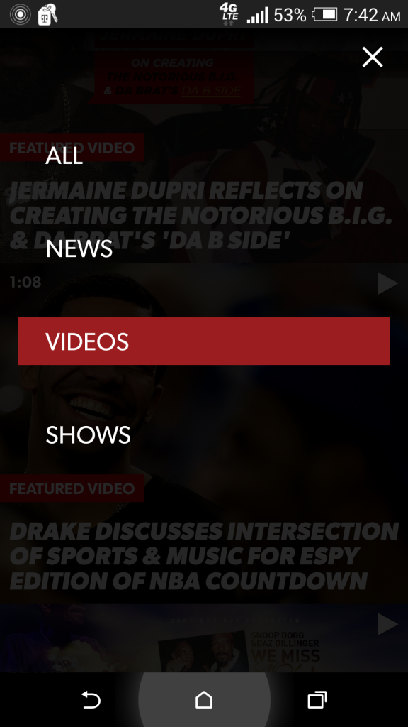 Video Gallery: This option gives you access to interviews, revolt news clips, and even some music videos. I did notice that the music videos tend to be running though Vevo/YouTube and you can chill on them and they will bring you to the app.