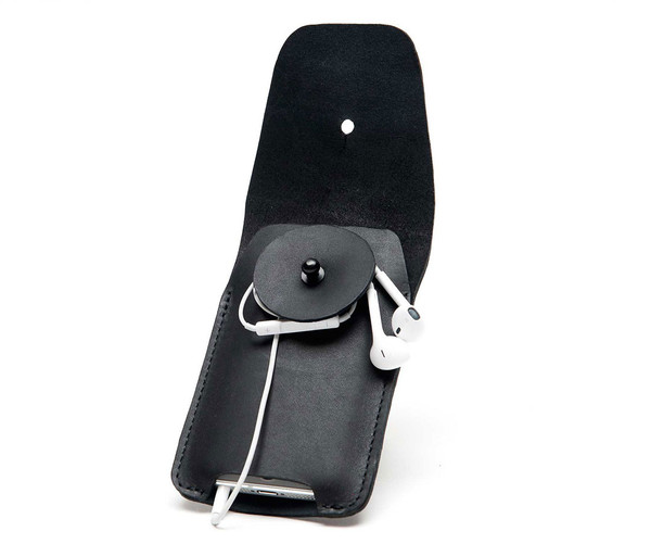A patent-pending leather wheel keeps ear buds tangle-free and readily available, and an Ultrasuede-lined inside panel cushions and cleans the iPhone screen—two features that make the Spinn truly one-of-a-kind. Optional is a holster to clip on to your belt.