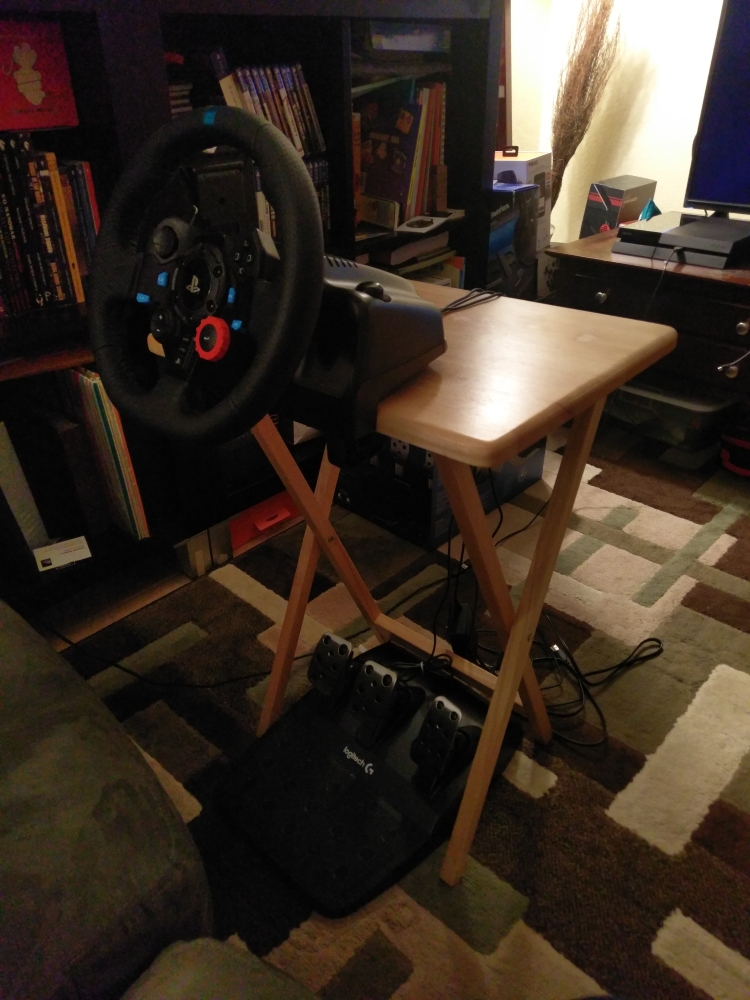 The old wheel had a very plastic feel to everything. It was well made, but it also looked like a toy. This new G29 Driving Force has grown up and is for grown ups. The base of the steering wheel controller is still made of plastic and it’s molded to look like the front end up a Mustang. It’s solid and heavy and clamps on tightly to any table or stand you want to use. In my case, I’m using this thing here. It’s not the best solution, but it works for the time being.