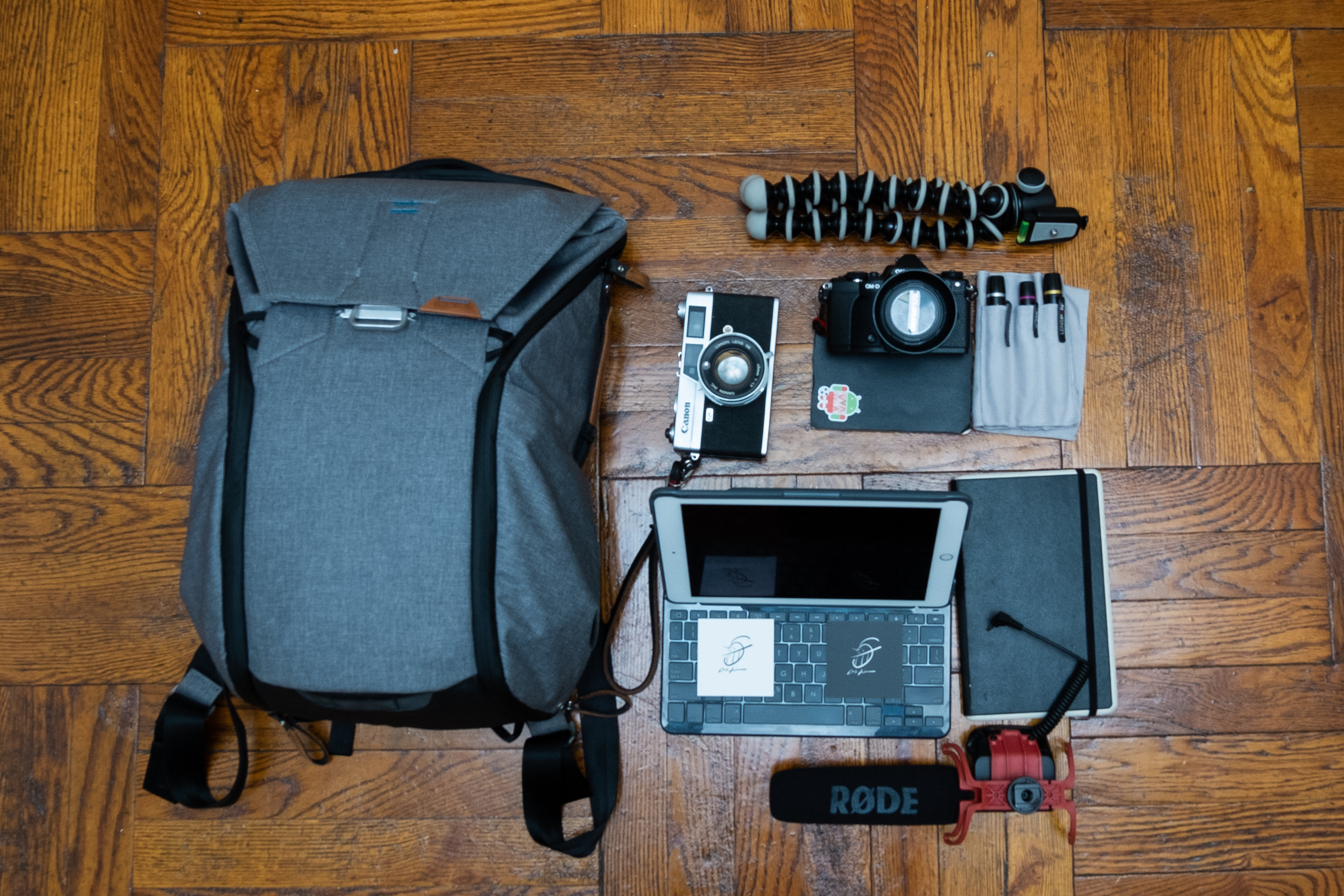 First thing is first, the Peak Design Everyday Backpack is my second go-to bag; I primarily use it when going to an event or small 1 short gig. His tight weight, holds plenty of stuff, and modular-allowing me to mark room for whatever I may be carrying that day. On this particular day l was just planning on shooting some street portraits so I opted for a simple load out: