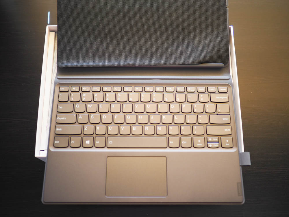 The second part of the Lenovo Miix 630 is the keyboard cover. It features full-sized keys with backlighting, a touchpad, and a little loop to hold the digital stylus. The back of the cover is hinged in the middle and can be bent to act as a stand that can be angled in a bunch of different positions. The tablet portion is held in place with some super powerful magnets. When the keyboard is not in use, it acts as the screen cover. Overall though, the keyboard cover is pretty nicely made. It’s got that leathery look and feel and the rear hinge for the stand is pretty strong. The keyboard is also pretty nice and feels nice a clicky.