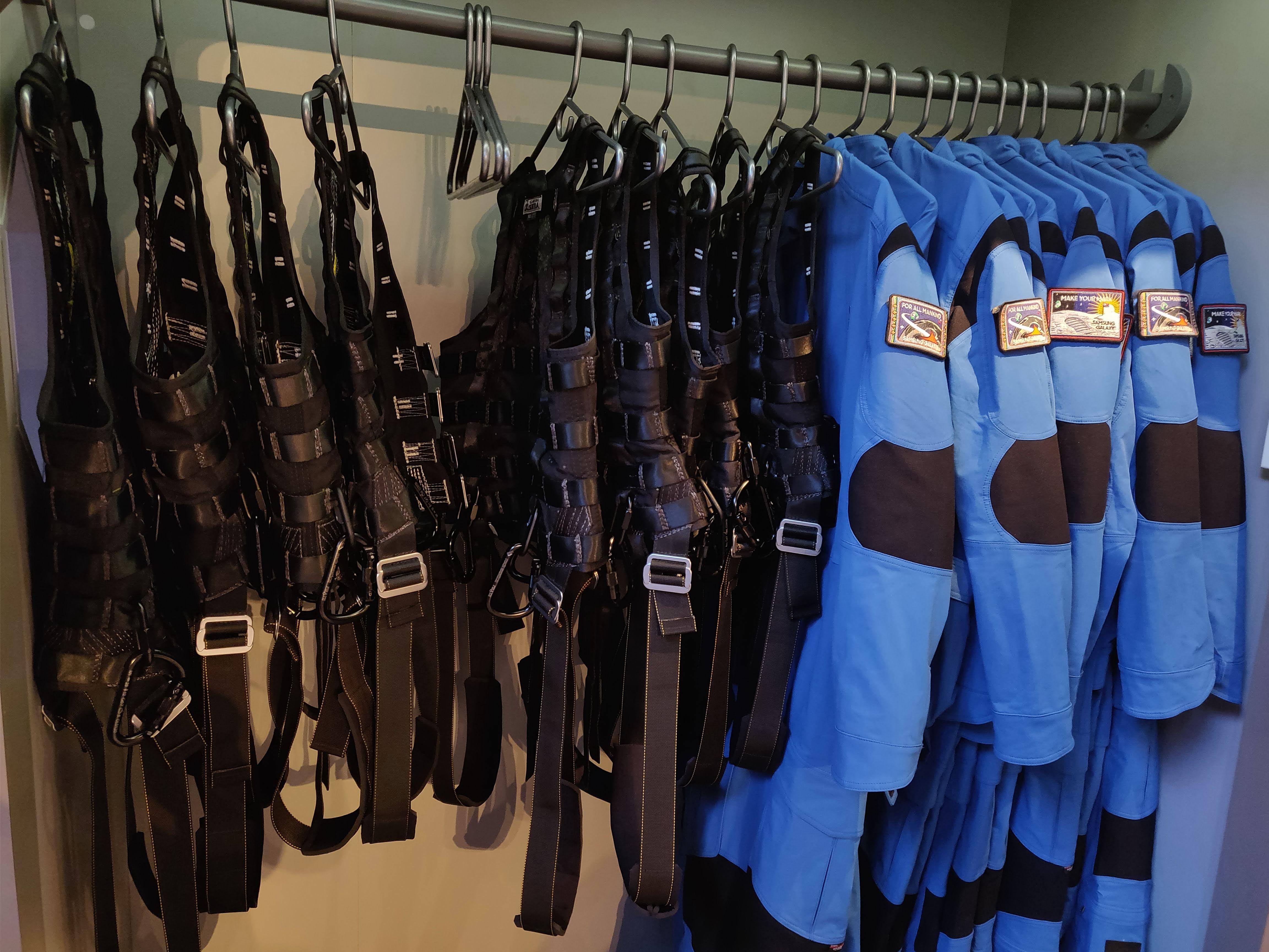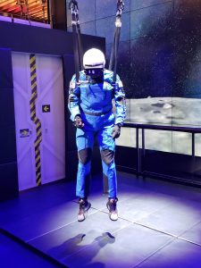 It is quite the right being suited up and I mean it’s not a simple throw up on of a jumpsuit. It involves putting on a harness, gloves and the suit. Everything has to be fitted perfectly with no loose areas as you will be hoisted up via cables to relive the walks and jumps on the moon.