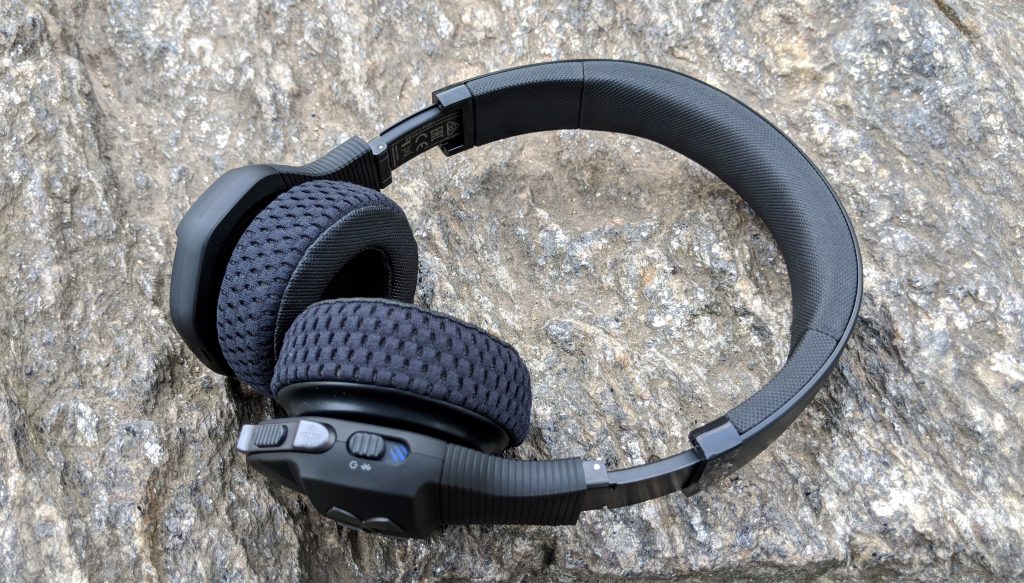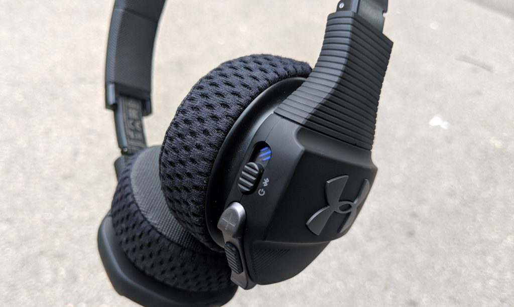 Ear Cups are hexagon shaped with a slight matte black rubber type finish which assists with gripping while hands maybe sweaty. Both sides have the UA logo but the right ear utilizes their TalkThru Button. More on this later. The Sport Wireless Train has foldable ear cups so they can be placed inside the included hard case is actually outfitted with SuperVent as well so you can air those headphones out after working out. It’s a nice sturdy rugged case too as I have thrown in and out my bag and not taken a scratch yet.