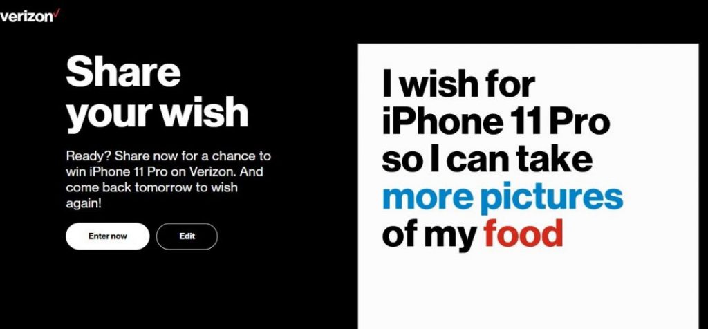 To enter all you have to do is go to verizon.com/iphone1111 and create a wish stating how you would you would use Apple’s latest iPhone 11 Pro. You can make a wish any time of the day but doing so at 11:11 am or 11:11 pm will garner you 11 additional entries as you can only enter once a day.