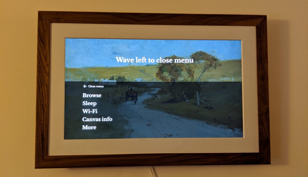 Hidden within the frame is hand gesture sensors. You can swipe left or right to change photos or up/down to change settings or even get artwork info. All this can be achieved from the app too, but your guests will be amazed from the hand gestures. Just make sure to advise you do not need to actually touch the frame. The app will also let you turn down the brightness, change orientations and create playlists. There is even the ability to have the frame go to sleep when the room is completely dark.