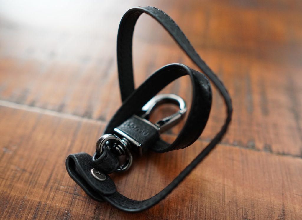 It has a push button at the top that pops open the case and reveals the earbuds. At first press it felt kind of stiff but doing it over time it started to loosen up more. The case itself is outfitted in a tumble leather material. There is a hook at the top if you want to attach lanyards or chains while on the bottom is a Type-C port.