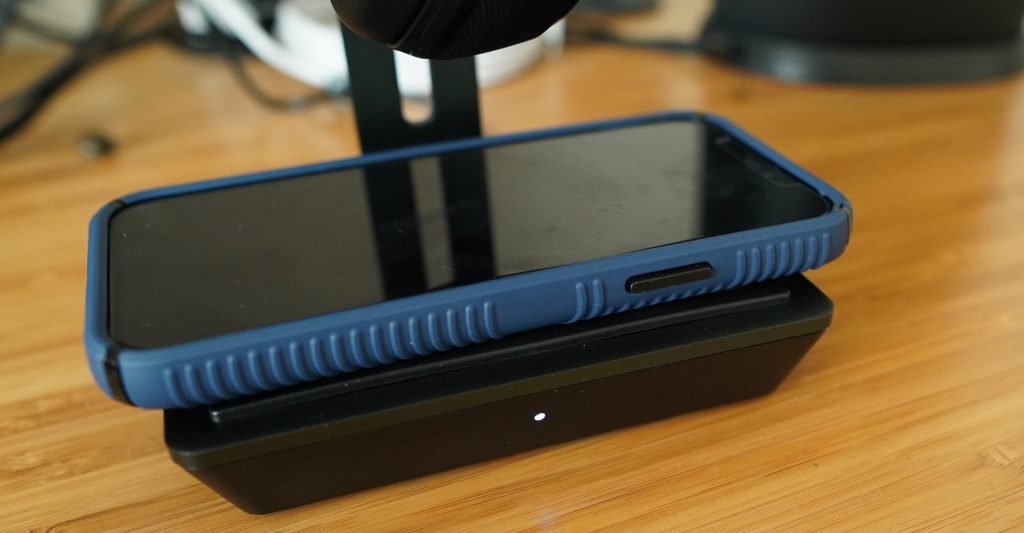 The headphone stand has mentioned has a wireless charging base that will utilizes 12W QI. There is also a LED light to advise of it charging. I have used it to charge an iPhone 12 Pro and Samsung Galaxy Z Fold 2 thus far. Like the rubber material on the bottom there is a decent amount on top where you would rest your headphones, so they don’t slip out of place.